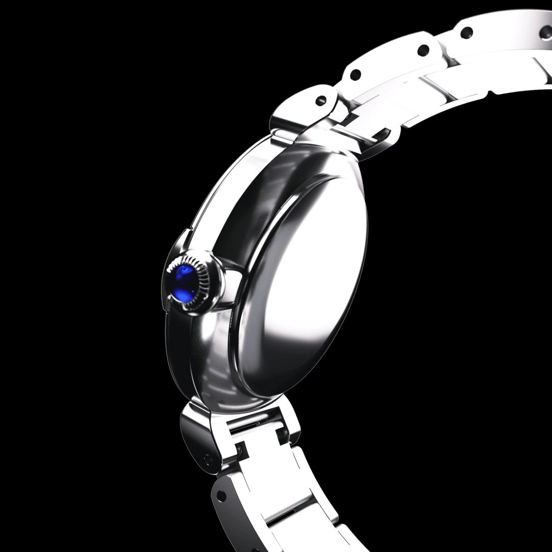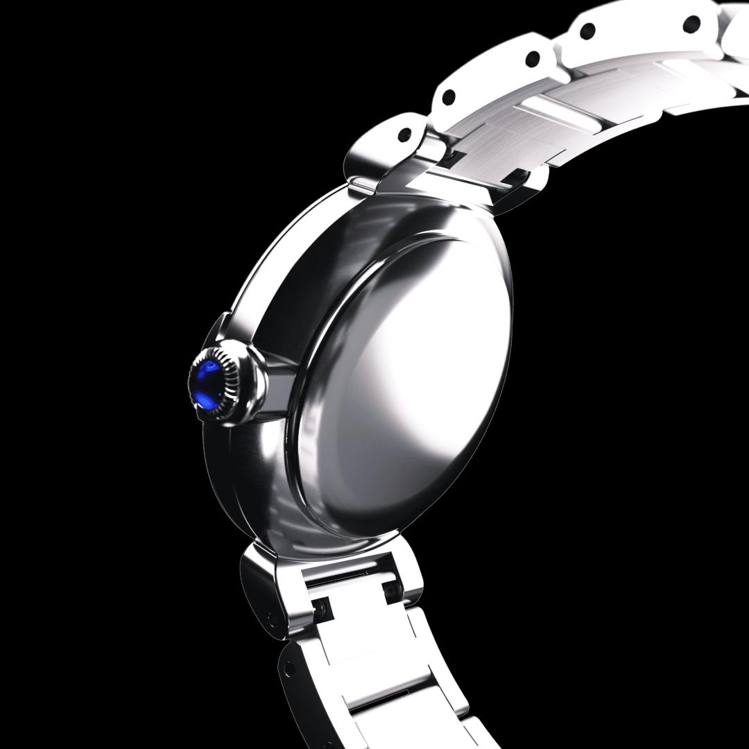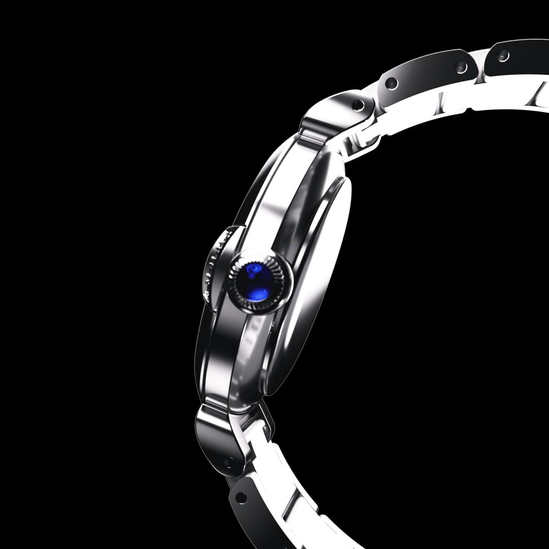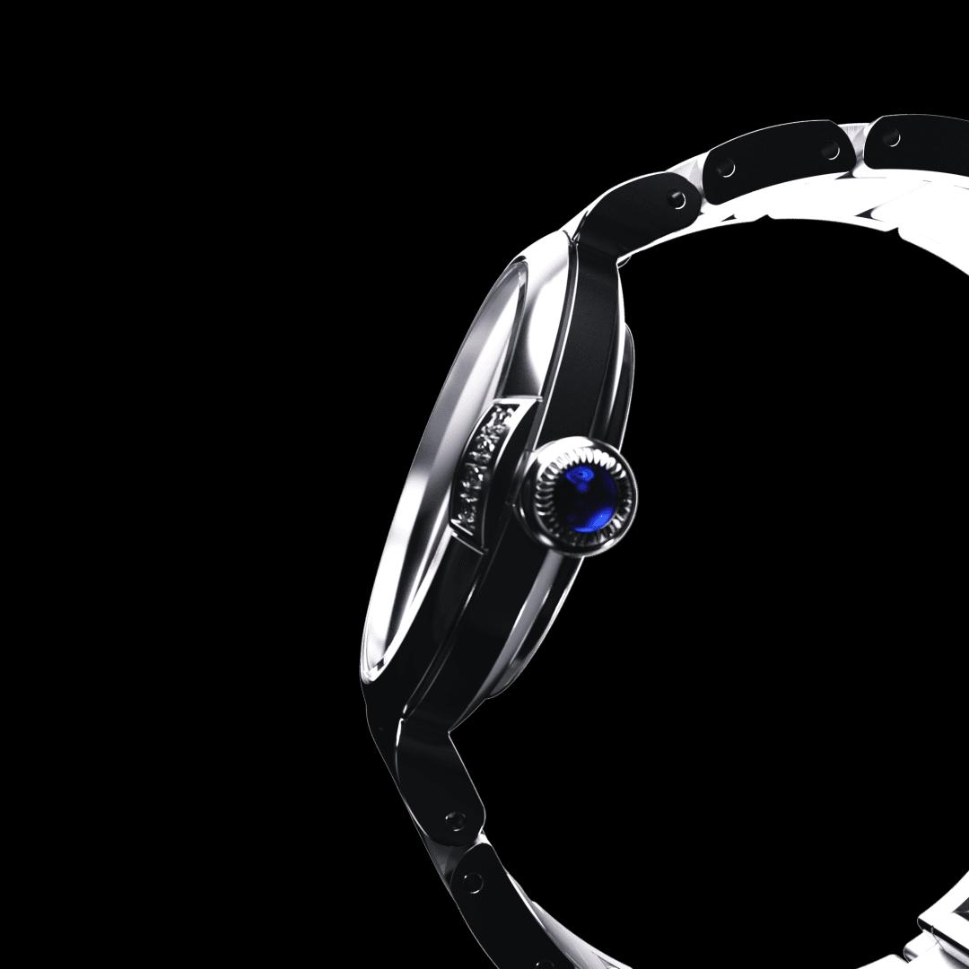 This model is inspired by May bells, the floral symbol of happiness. The cluster of four diamonds adorning the gently curving forms of the case make for a design as brilliant as fine jewellery. Evoking a dewdrop glimmering on flowering May bells, the single diamond on the mother-of-pearl dial accentuates the limpid blue of the crown.
