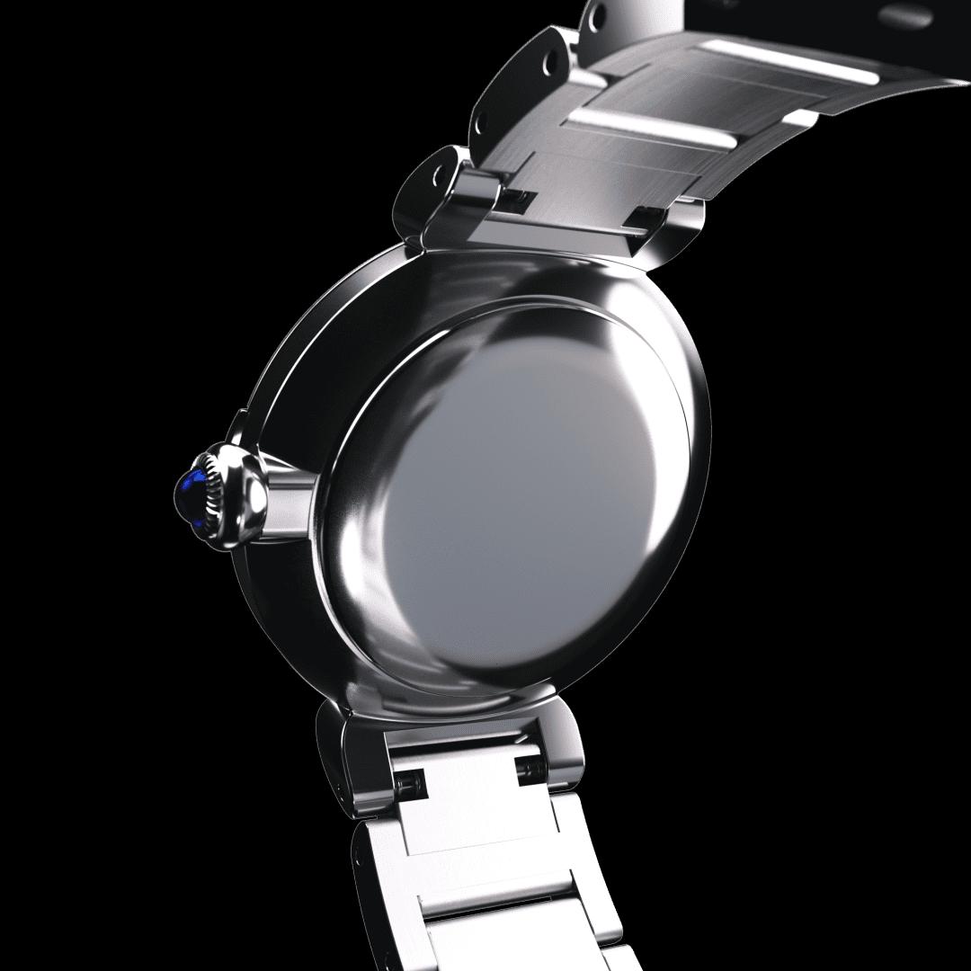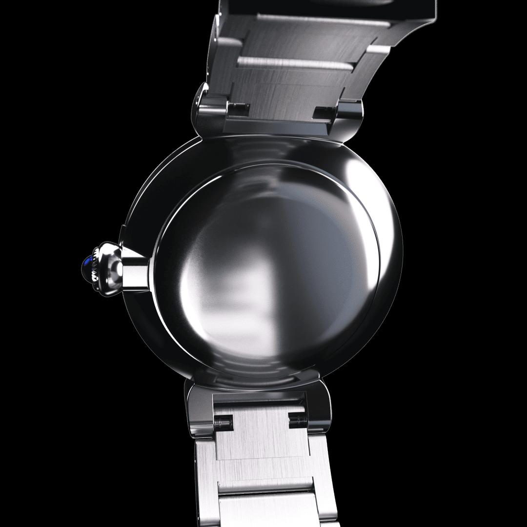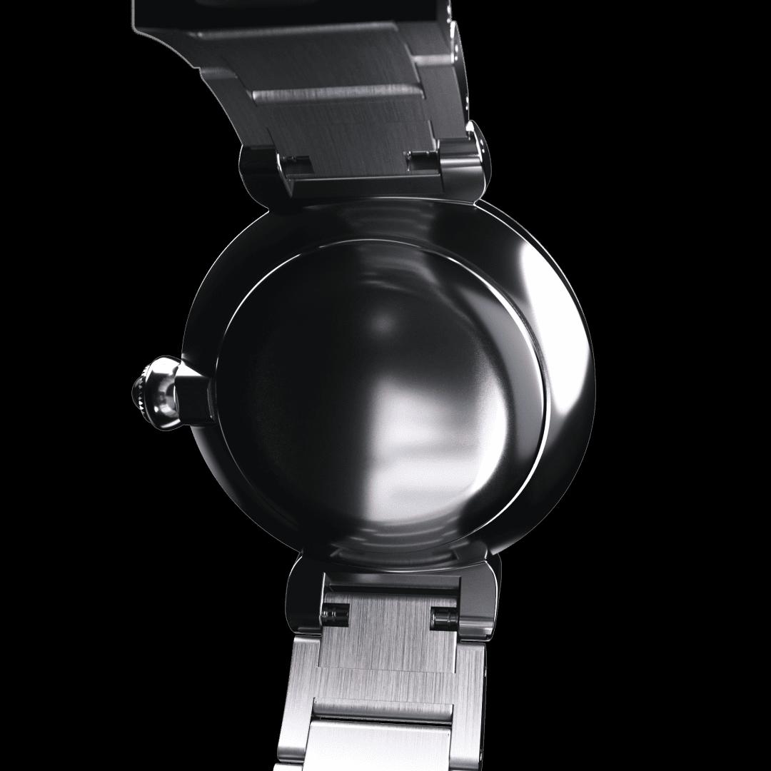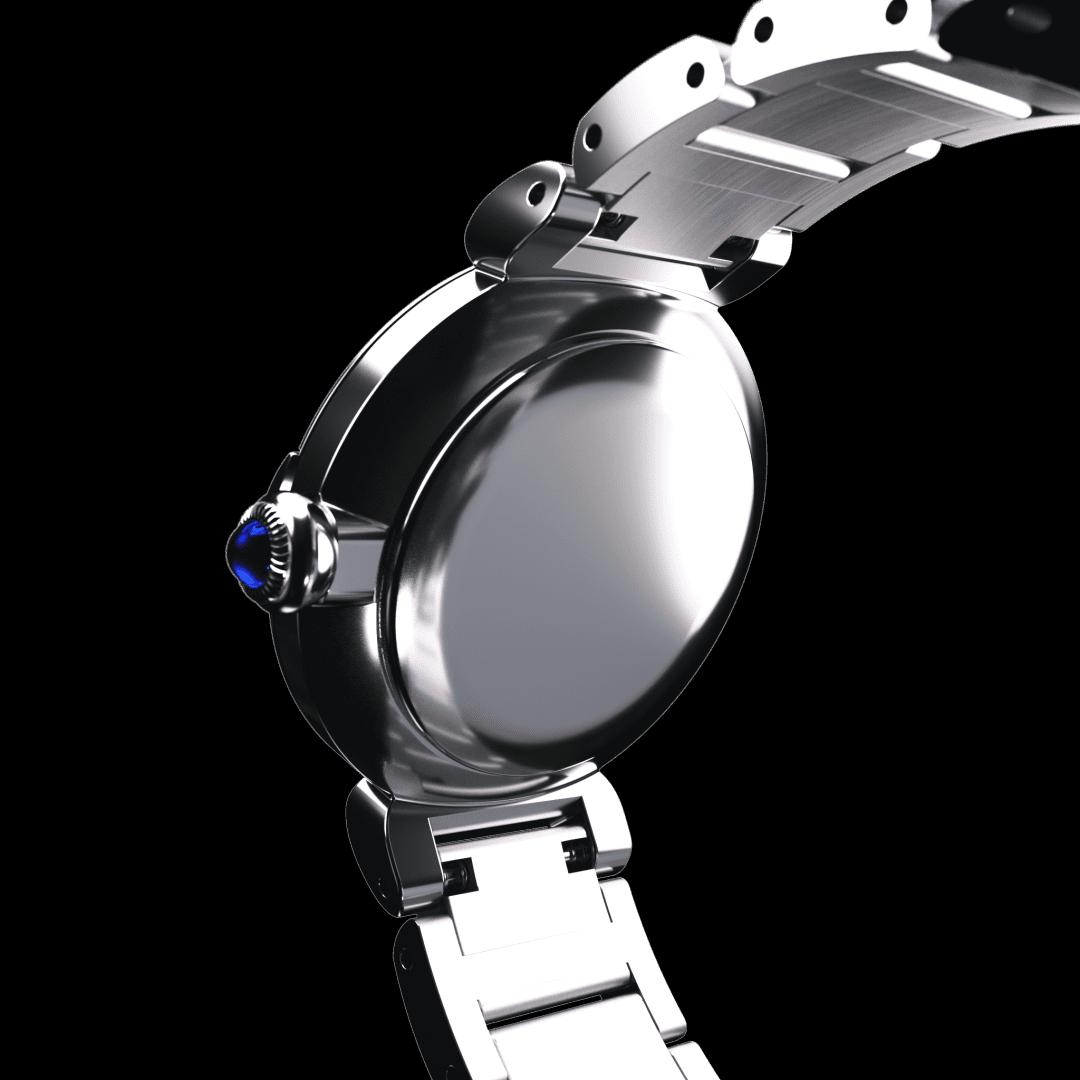 This model is inspired by May bells, the floral symbol of happiness. The cluster of four diamonds adorning the gently curving forms of the case make for a design as brilliant as fine jewellery. Evoking a dewdrop glimmering on flowering May bells, the single diamond on the mother-of-pearl dial accentuates the limpid blue of the crown.